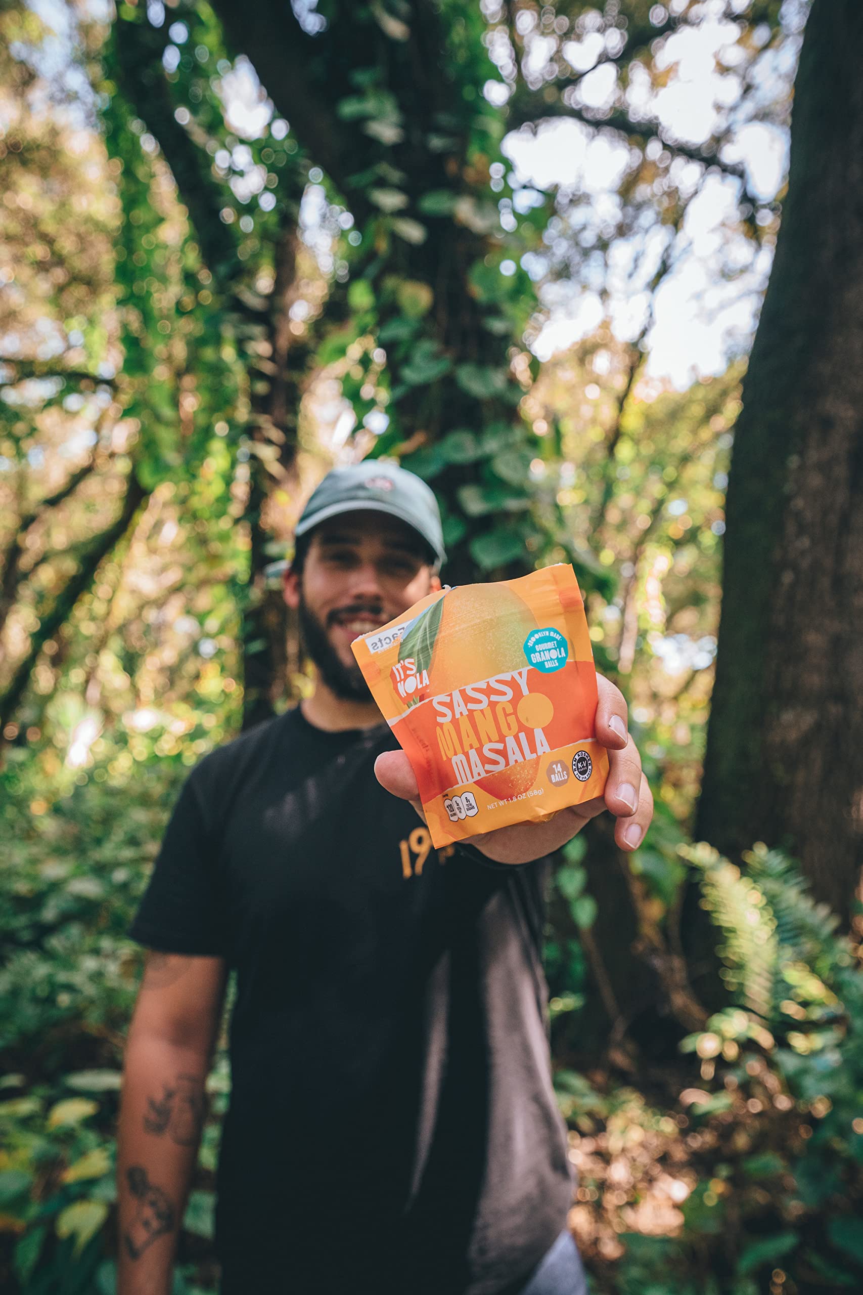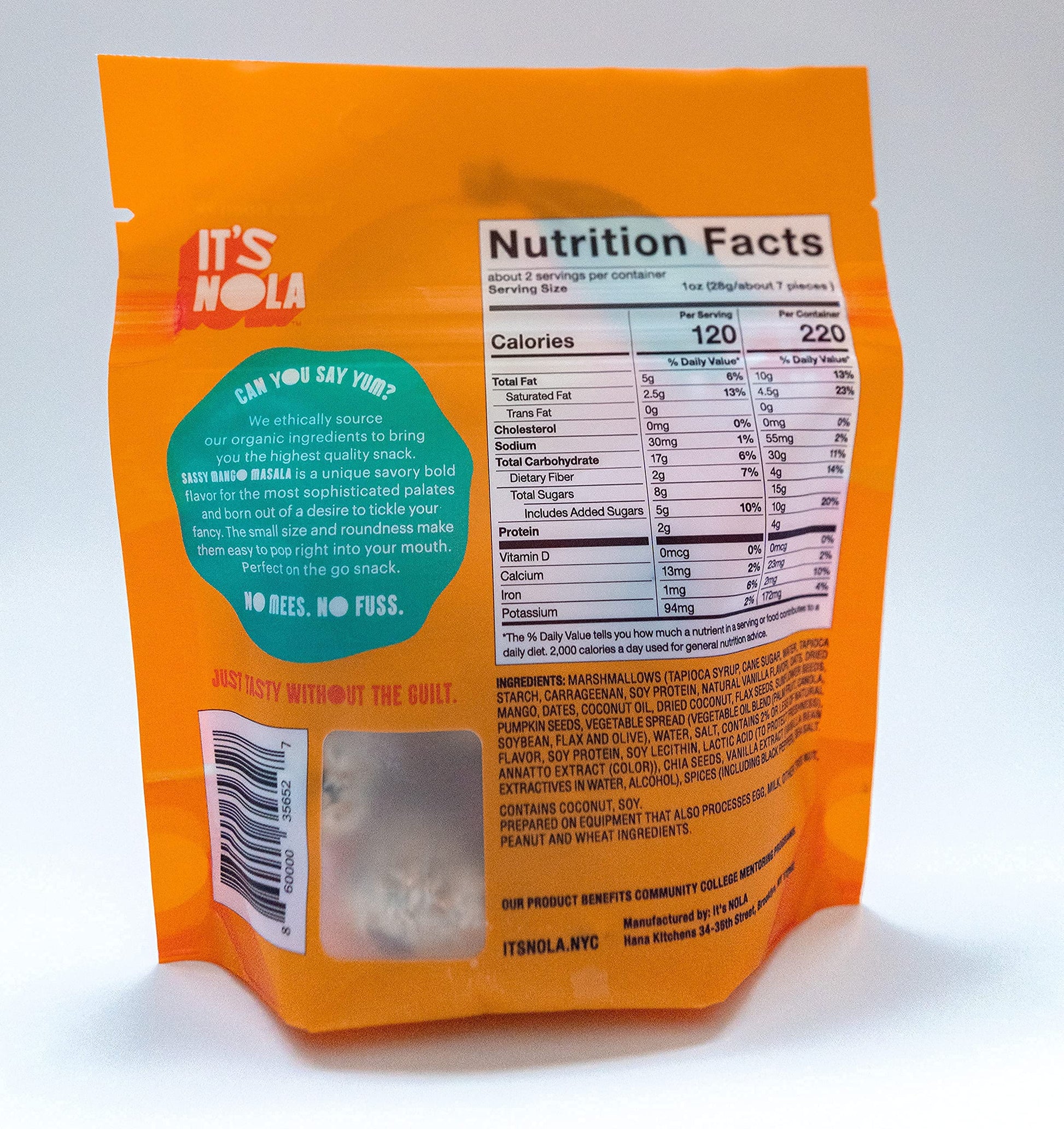 - 1.9oz bag of a delightful combination of ethically sourced rolled oats, sunflower seeds, chia seeds, pumpkins seeds, flaxseeds, cashews, proteins, sea salt, and the stars of the show: MANGO and MASALA bound with a vegan binder. Combined, these heaven-sent ingredients create a dynamic savory flavor!