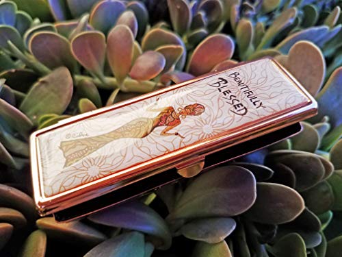 Details: This Rose gold colored metal alloy lipstick case and compact mirror features high quality art with a felt inside lining.