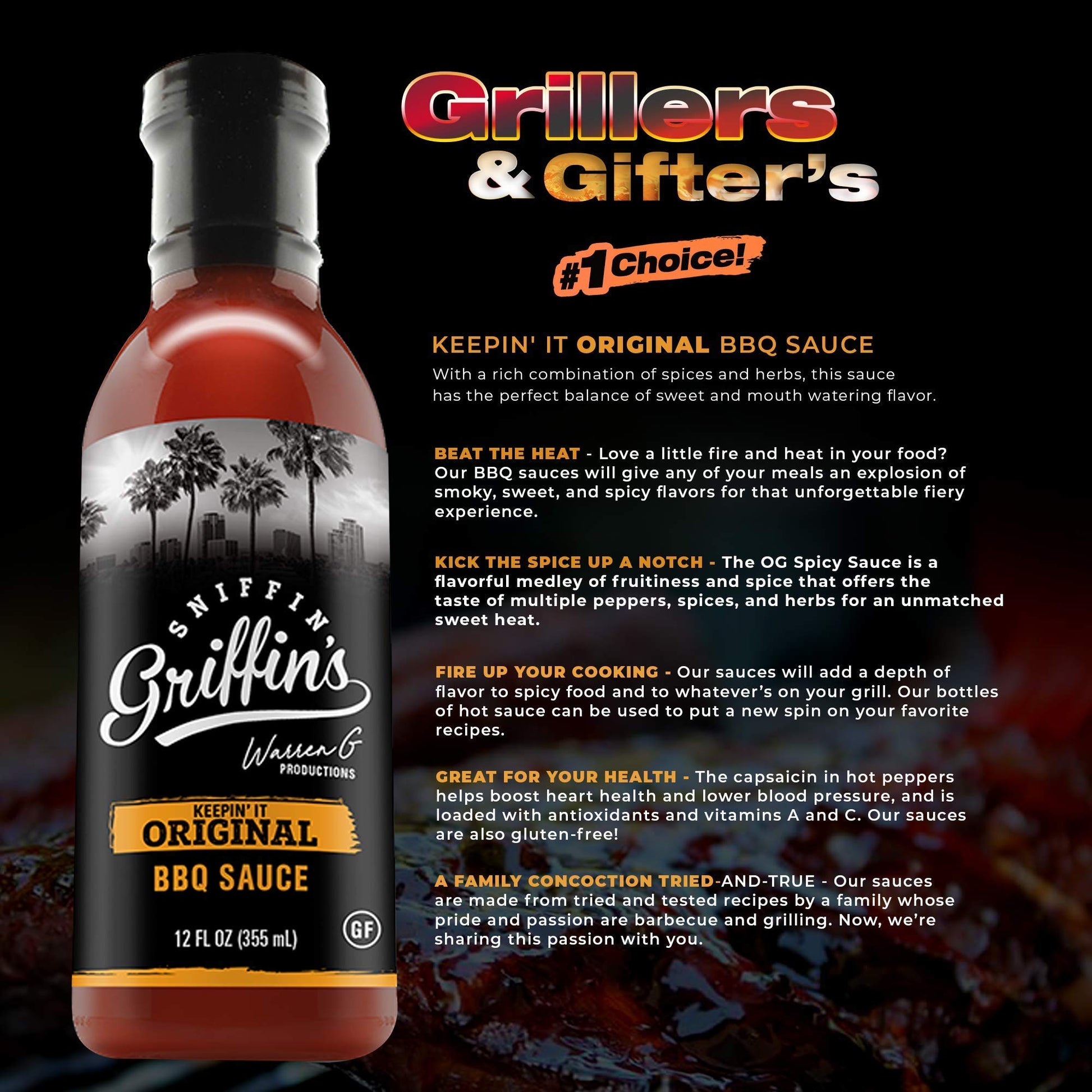 - KEEPIN' IT ORIGINAL: Sniffin Griffin's Original BBQ sauce delivers a sweet smoked flavor with a mild kick of red chili pepper spice! Add a deep, delicious, spicy flavor to anything you grill with our OG Barbecue Sauce.