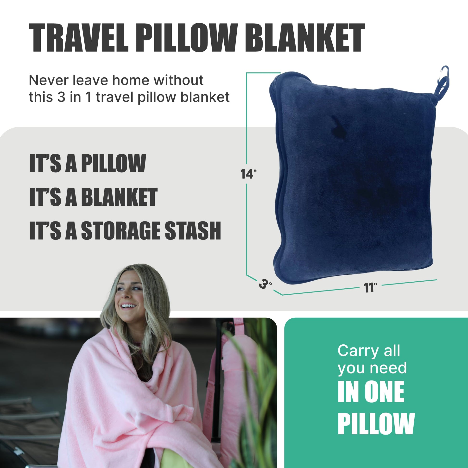 - COMPACT DESIGN FOR TRAVEL: This pillow blanket is a 3-in-1 solution combining a soft blanket, a pillow or a storage stash. Compact enough for airplanes, cars, and long flights, it includes a storage bag to keep your essentials organized.