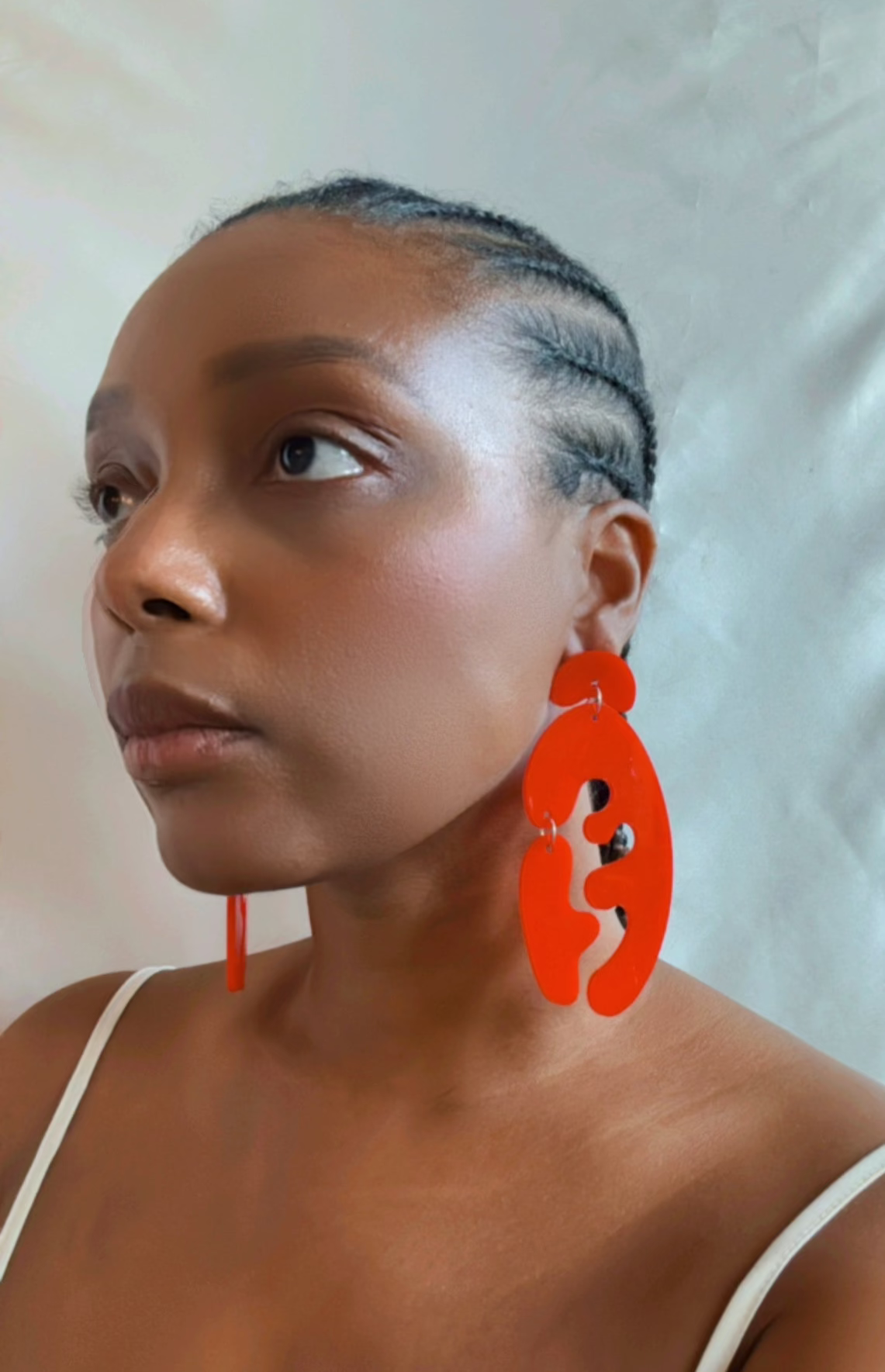a red retro arch earring. approximately 4 inches long.